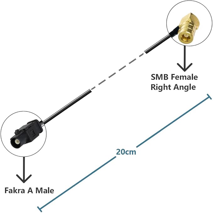 コネクタ1:SMBメス直角90度 | コネクタ2:Fakra Aオス | ケーブルタイプ:RG174 | ケーブル長:20cm | インピーダンス:50オーム;