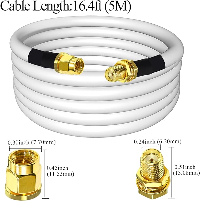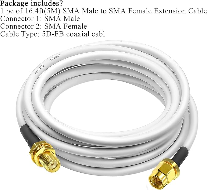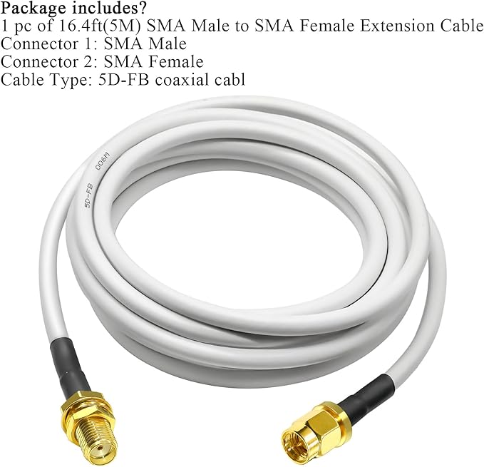ケーブルの種類と詳細: SMA ケーブル; ケーブルの種類: 5D-FB 同軸ケーブル; 導体材質: 純銅; ケーブルの長さ: 16.4 フィート (5 メートル); インピーダンス: 50 オーム、低損失