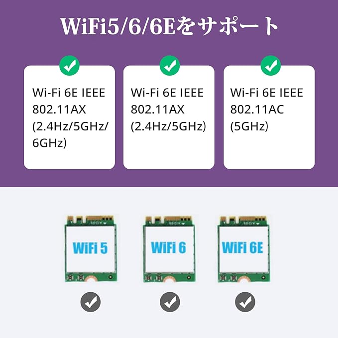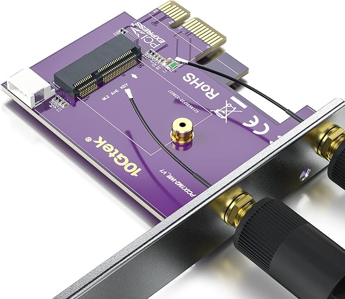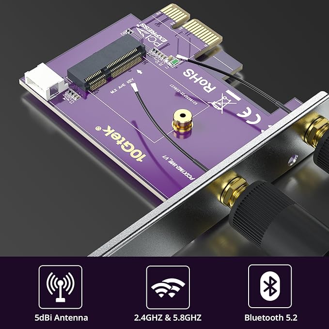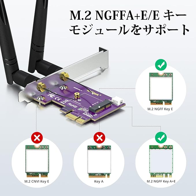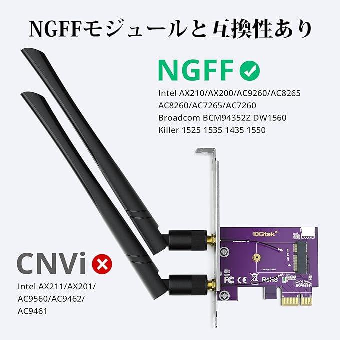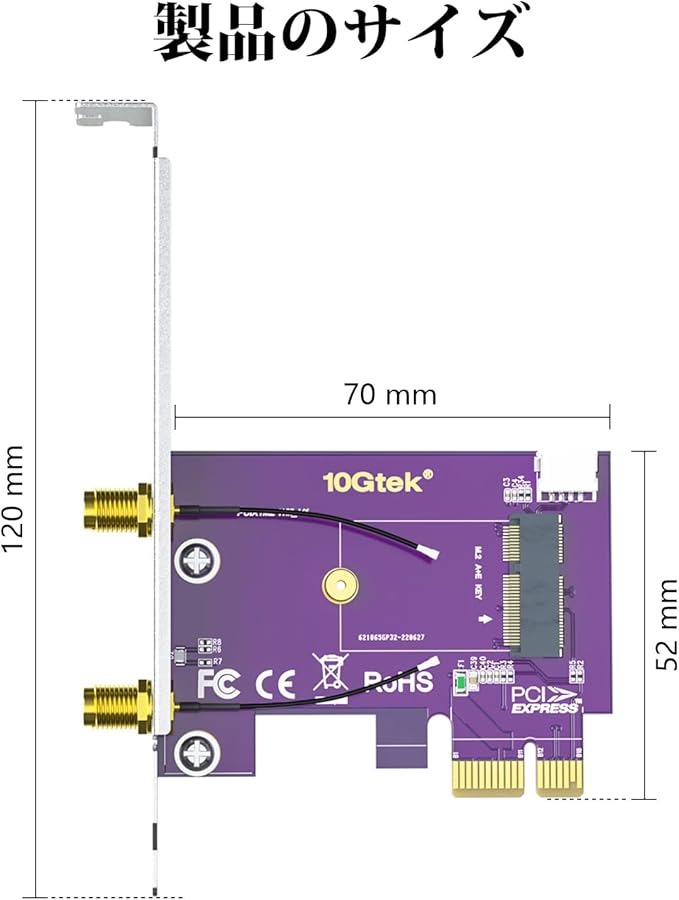 10Gtek PCIE X1-M.2/NGFF (A+Eキー) WiFi Bluetooth ワイヤレスモジュールアダプターカード デュアルバンド 2.4&5G 2X 5dBi アンテナ WiFi 5/6/6Eをサポート