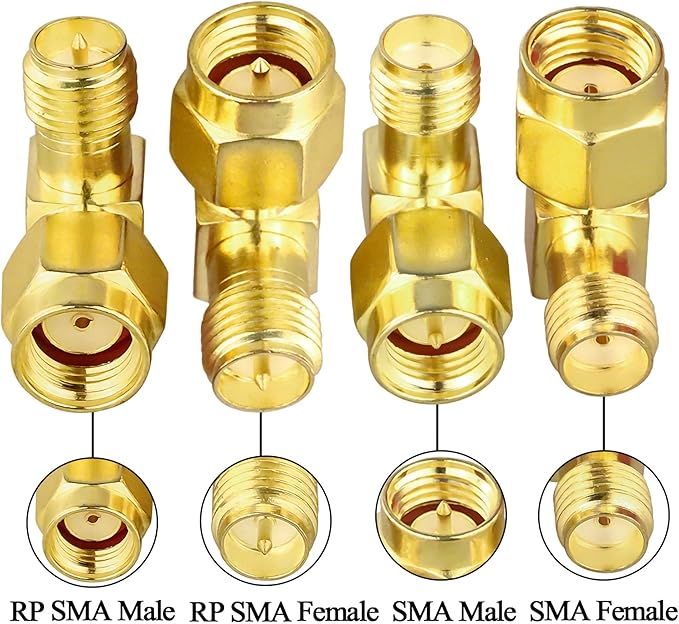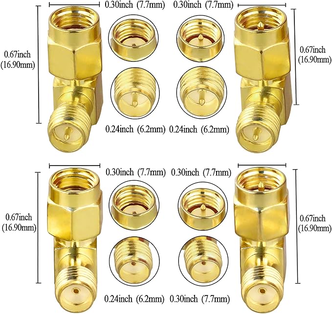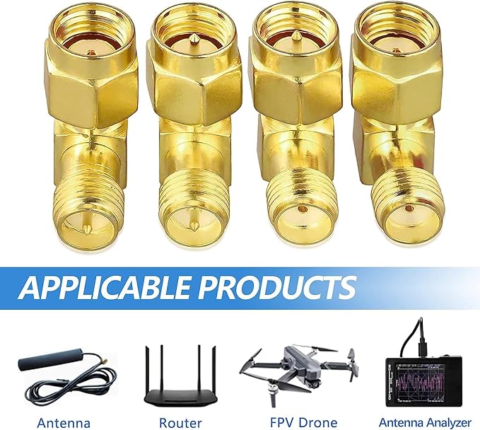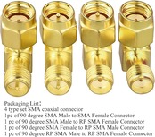 パッケージ内容: 90 度 SMA 直角コネクタ 4 個 (90 度 SMA オス - SMA メス コネクタ 1 パック、90 度 SMA オス - RP SMA メス コネクタ 1 パック、SMA メス - RP SMA オス コネクタ 1 パック、RP SMA オス - RP SMA メス コネクタ 1 パック。