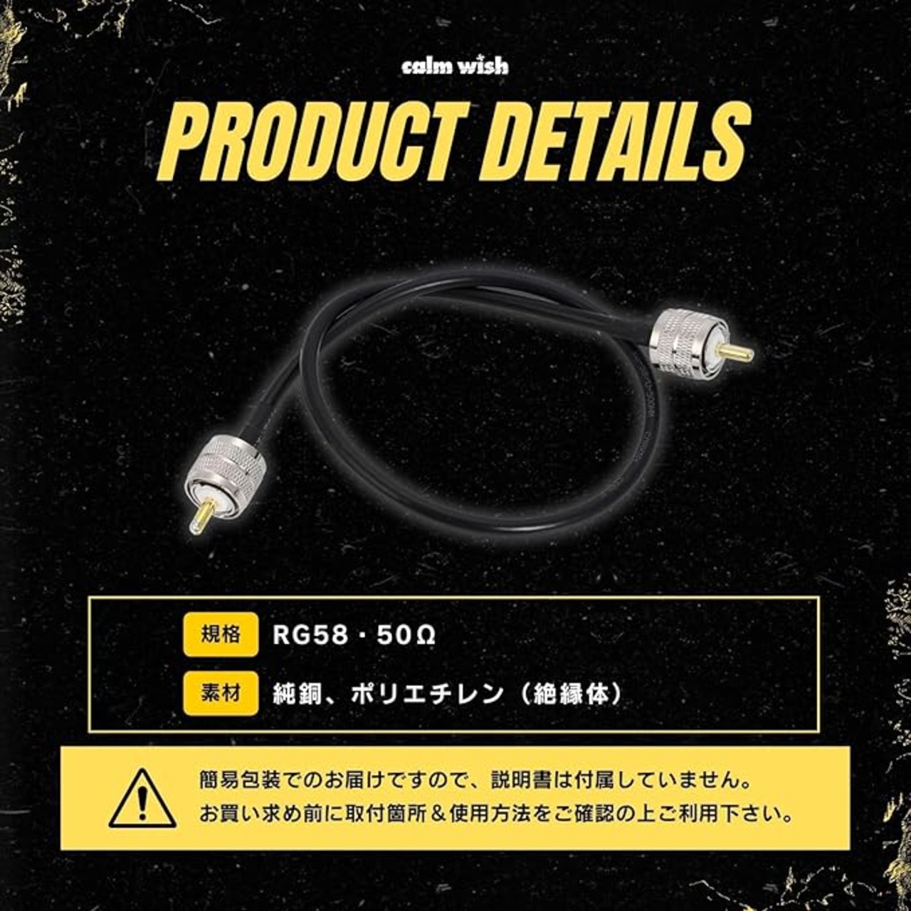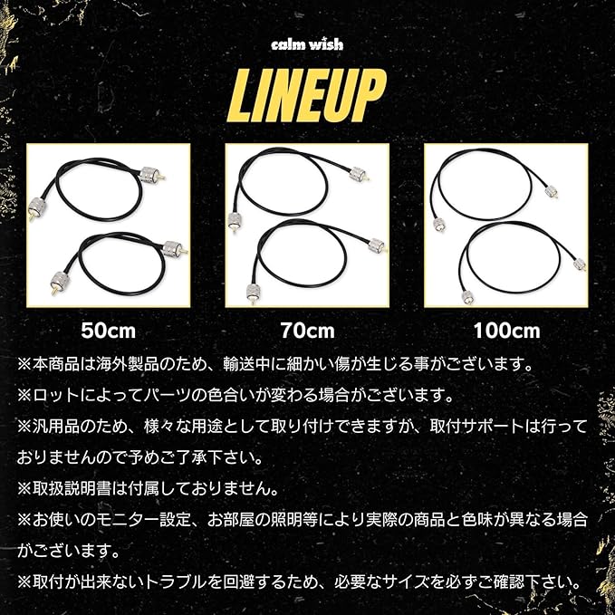 当商品は、長さが50cm、70cm、100cmから選べるバリエーションを提供しており、外径は5mm、材質は高品質の銅で、規格はRG58、インピーダンスは50Ωです。