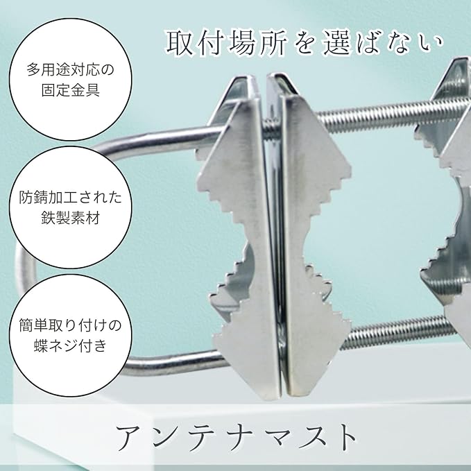 【多用途対応の固定金具】テレビ・BSアンテナ、パラボラ、アマチュア無線など、直径約52mmまでのポールやパイプをしっかり固定できます。屋外での使用に最適な設計。