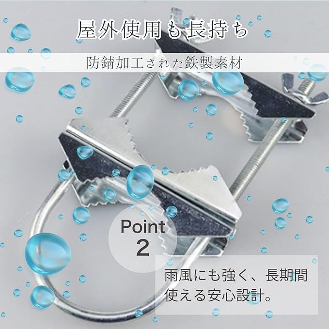 【防錆加工された鉄製素材】雨風にさらされる屋外でも安心して使用できる、防錆加工された鉄製のクランプ。耐久性が高く、長期間の使用が可能。
