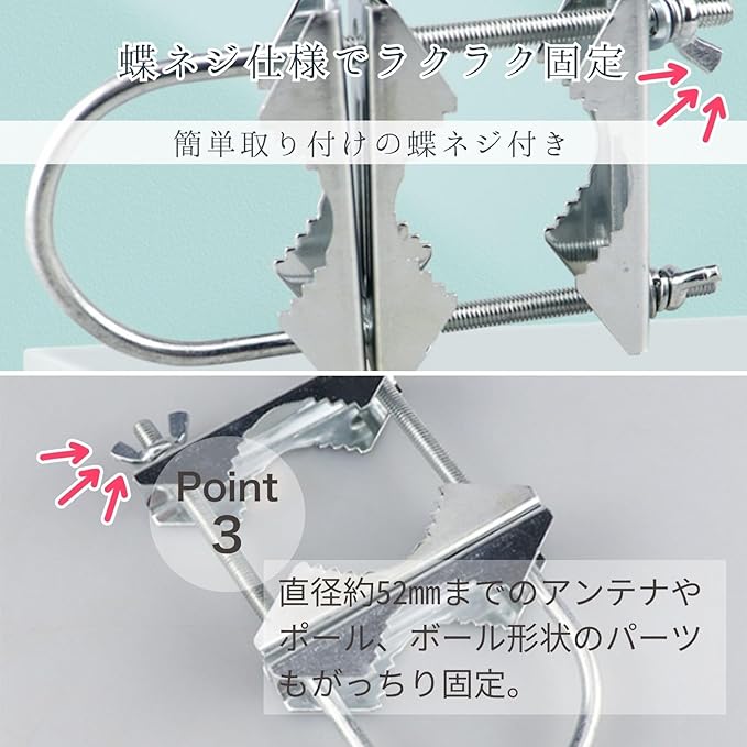 【簡単取り付けの蝶ネジ付き】ウィングボルトの蝶ナットで簡単に取り付けができ、直径約52mmまでのアンテナやポール、ボール形状のパーツもがっちり固定できます。DIYや屋外用途にも最適。