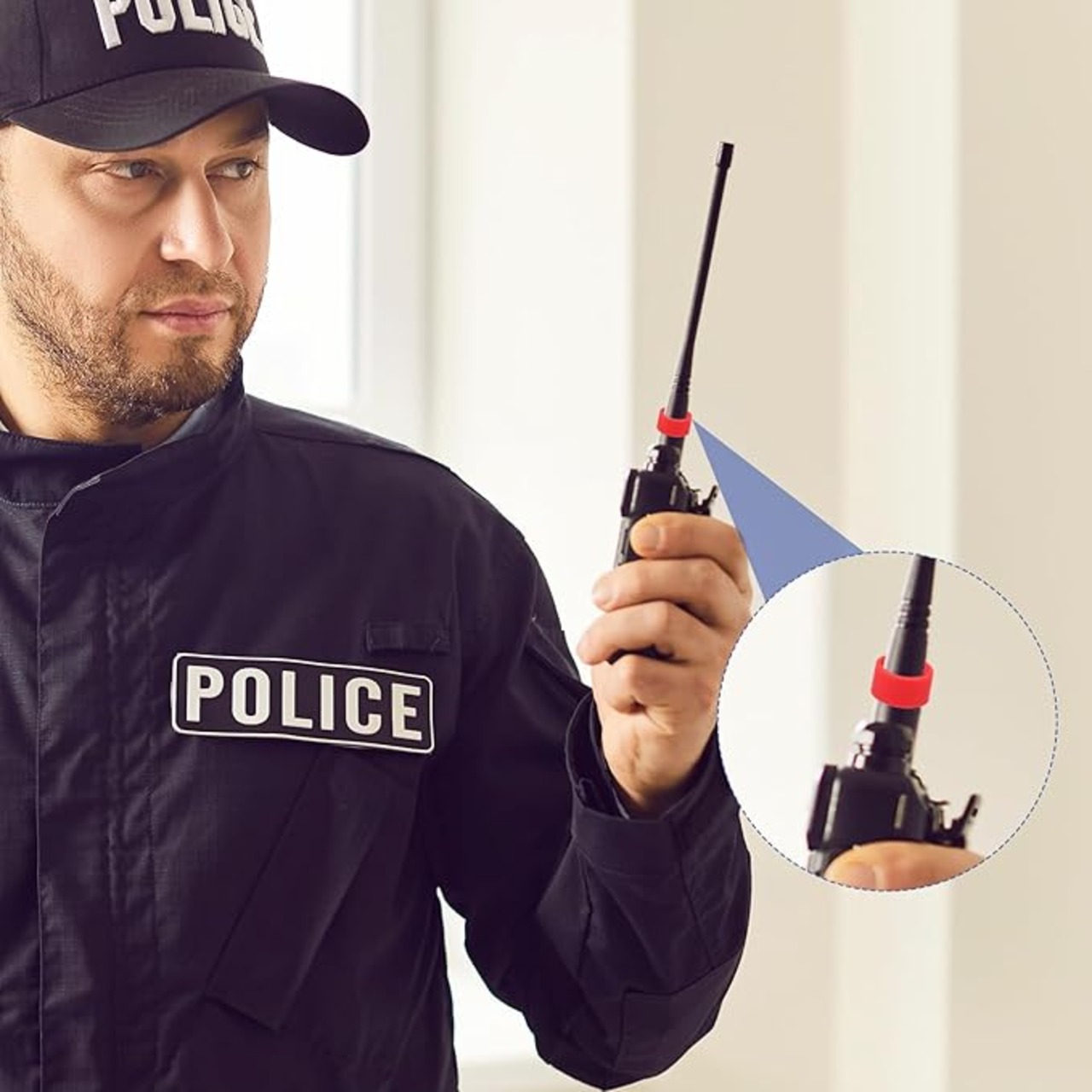 使用方法:ゴムリングを優しく伸ばしてアンテナ基部に装着し、所定の位置までスライドさせます。必要に応じてゴムリングの位置を調整し、しっかりフィットするようにしてください。