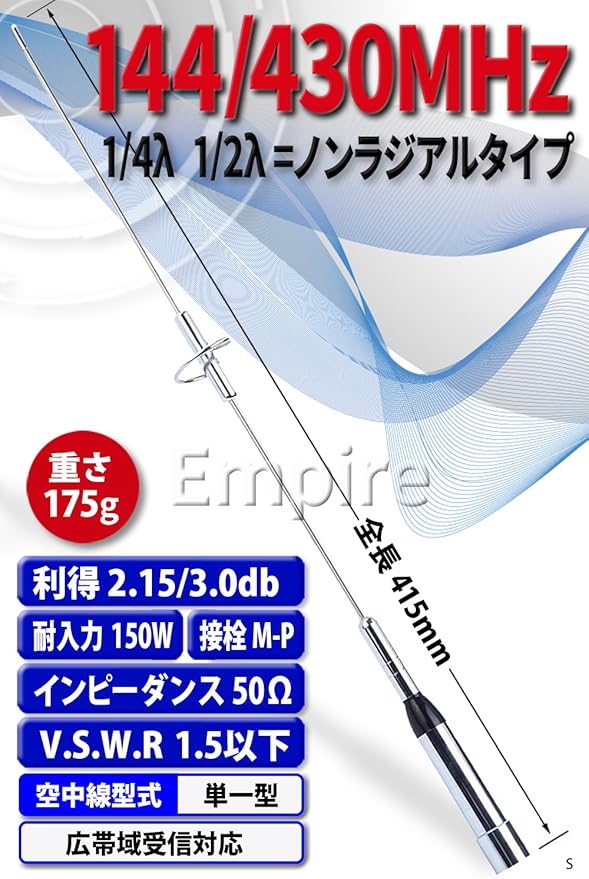 V.S.W.R. 1.5以下長さ 415mm ・ 重さ 175g・インピーダンス 50Ω・接栓 M型