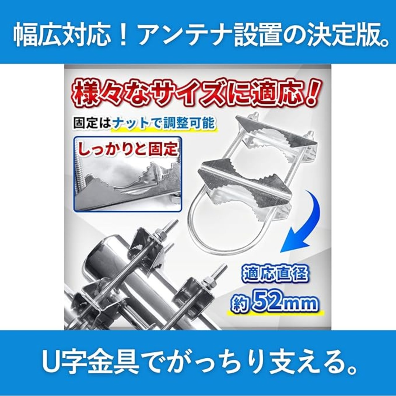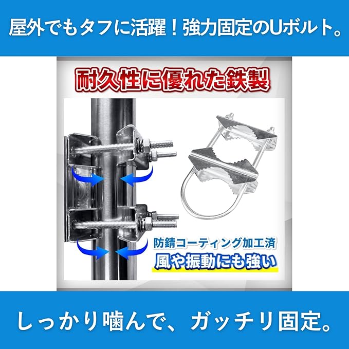 U字型金具:U字型の金具により、アンテナの取り付けが簡単で、設置時にしっかりと安定します。