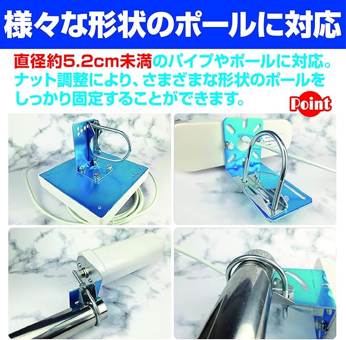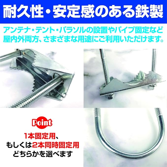 アンテナ設置のほか、テント、パラソルの設置、パイプ固定など、さまざまな用途にご利用いただけます。鉄製なので耐久性、安定感あり。屋内外両方にご利用いただけます。