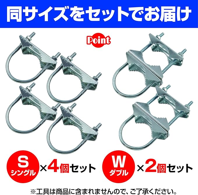 シングルタイプは同サイズを4個、ダブルタイプは同サイズを2個、それぞれセットでお届けします。シングルもしくはダブルタイプ、どちらかをお選びください。工具は商品に含まれませんので、ご了承ください。