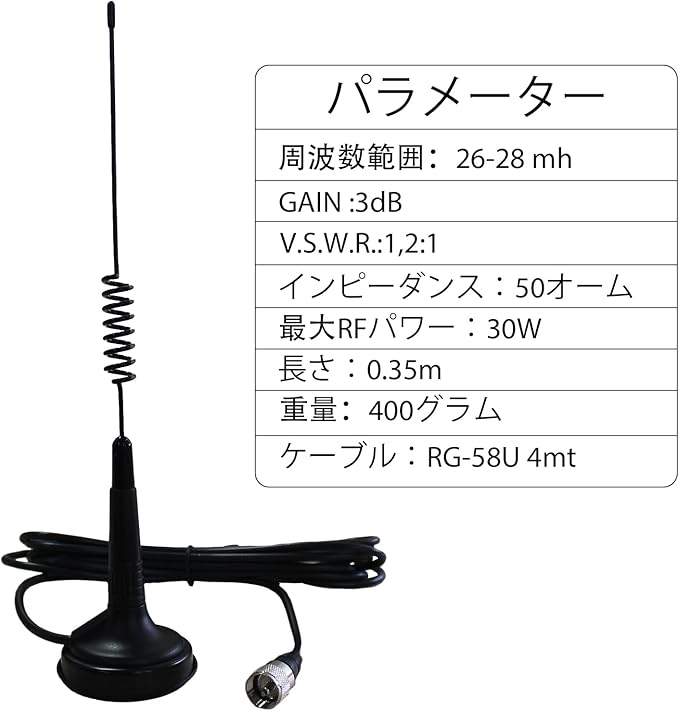 周波数範囲26~28 MHz(27MHz)、ゲイン:3dBi