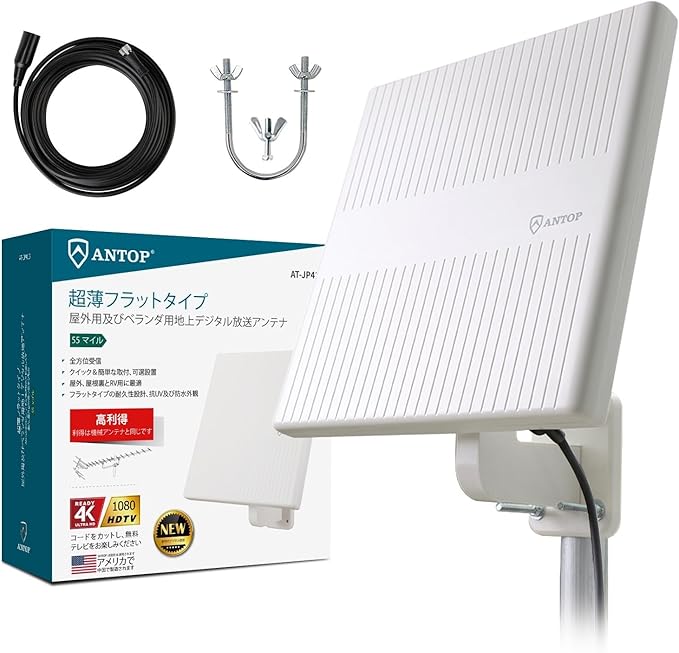 ANTOP 地デジアンテナ 屋外 テレビアンテナ 室外 地上デジタル放送用 UHF対応 HDTVアンテナ 88km受信範囲 360度全方位受信 5m同軸ケーブル付き 軽量 平面 ホワイト ATJP413