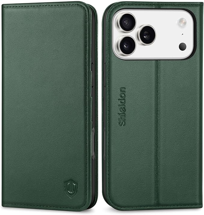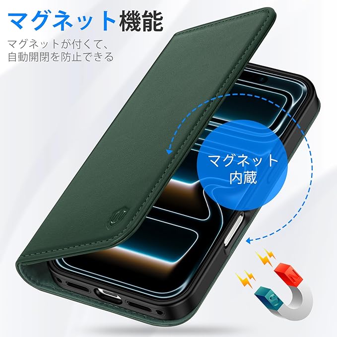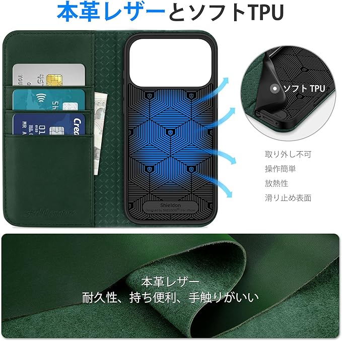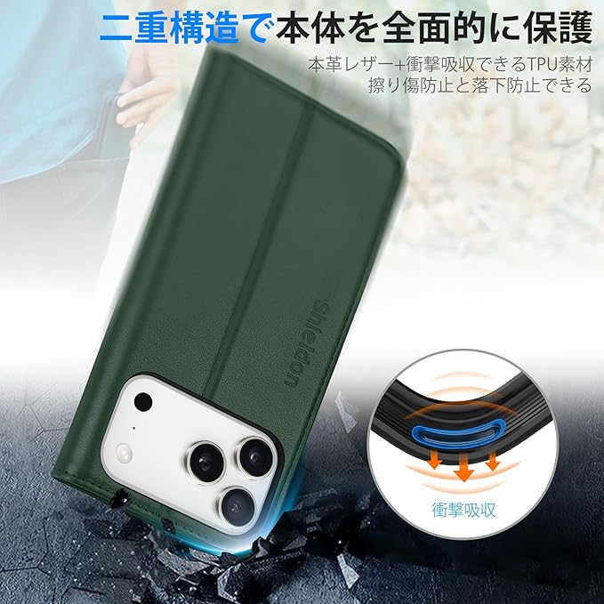 SHIELDON iPhone 17ProMax 対応 手帳型ケース 本革レザー 6.9インチ 5G TPU素材 カード収納 [RFIDブロッキング] 衝撃吸収 横置きスタンド機能 マグネット内蔵 あいふぉん 17プロマックス 対応 スマホケース 2025年発売 ミッドナイトグリーン
