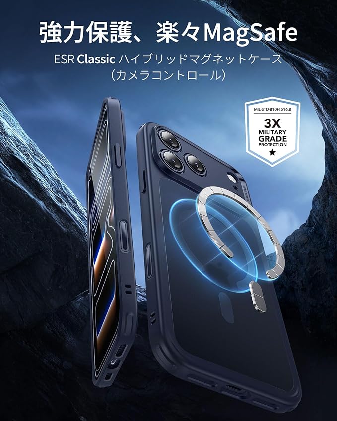 【3倍米軍MIL規格・MagSafe対応】ESR iPhone 17 Pro Max ケース ワイヤレス充電 カメラボタン付き SGS認証 エアガードコーナー 黄変防止 耐衝撃 PC背面TPUバンパー 指紋防止 高耐久性 マグネット Qi2.2対応 最大25W高速充電 マグセーフ いphone17promaxケース アイフォン17プロマックス専用Classic(フロストブルー)