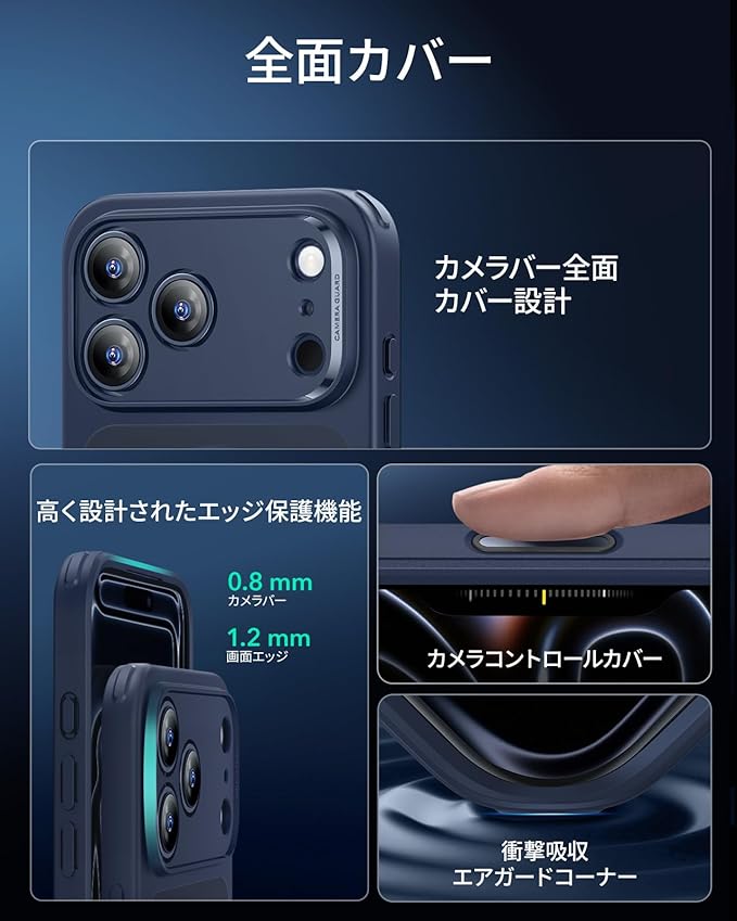 【キズを防止!精巧なレンズガード設計】アイフォン17プロマックスケース本体のカメラレンズエリア周縁を、わずかに盛り上げる特殊成形を採用します。机に置く際やポケットへの出し入れ時にレンズが直接平面に触れるのを防ぎ、大切なカメラモジュールをスクラッチから確実に保護します。ポケットへの出し入れやテーブル置き時のスクラッチから、大切な画面と高性能カメラをしっかり守ります。毎日の使いやすさと保護性を両立した、スマートな設計です