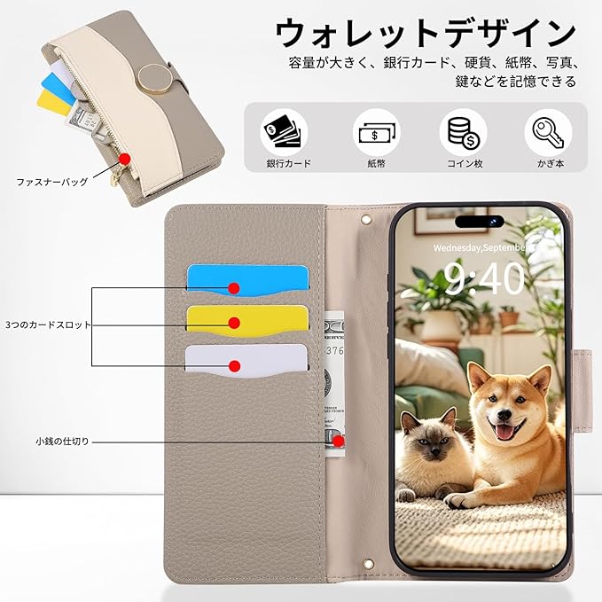『収納力抜群』 アイフォン17 pro max ケース の内側に3つのカードスロットとウォレットポケットを備え、外側にカードが収納できて、小銭入れも付いていたファスナー式ウォレットが付き、小銭、コイン、カード類や紙幣、名刺や定期券、免許証、交通系ICカード、メモ等収納でき、通勤も通学にもお出かけに便利。手ぶらで持ち歩ける斬新さとおしゃれな見た目が魅力。