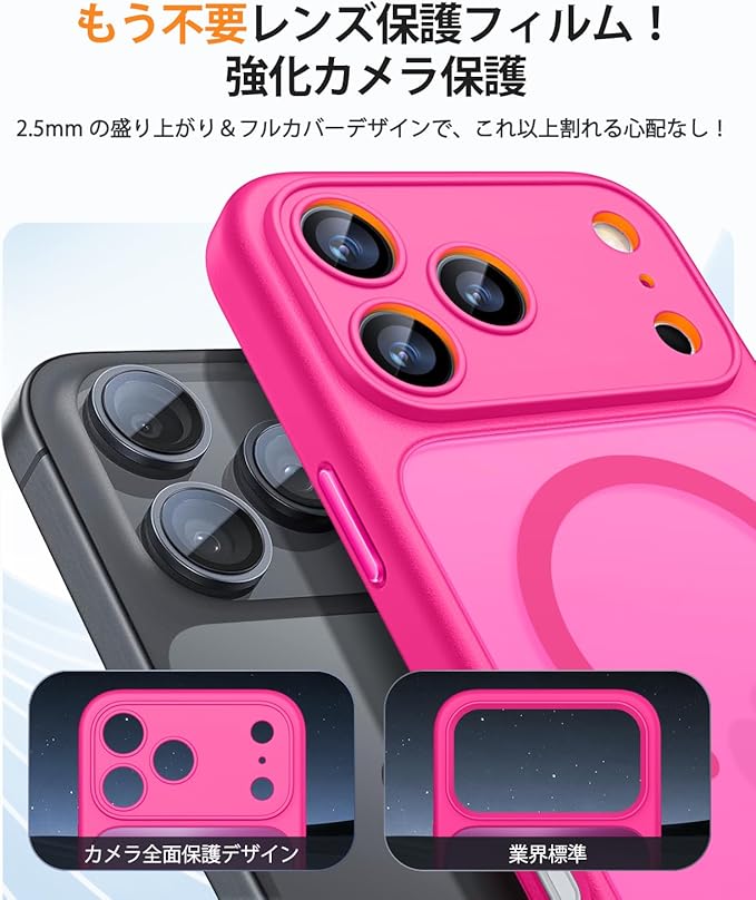 CANSHN iPhone 17 Pro Max 用 ケース Magsafe対応 カメラ全面保護 ワイヤレス充電 あいふおん 17 Pro Max 用 ケース 耐衝撃 エアガードコーナー 傷つき防止 指紋防止 リング マグネット搭載 半透明マット仕上げ アイフォン 17 Pro Max 用 カバー- ホットピンク