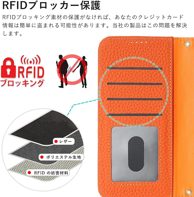 【高品質デザイン】外装はレザー製で、tpu素材に比べ、優れた耐衝撃性.カードスロットはRFIDブロック素材の保護設計で、クレジットカード情報が盗まれるのを防ぐことができます。スタイリッシュな外観、優れた耐傷性と防塵性能。変形しにくく、完全な保護を提供することができます。