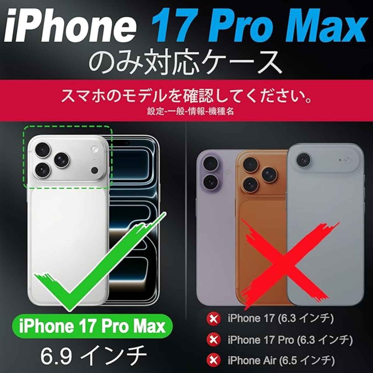 【対応機種・型番確認】iPhone 17 ProMax(6.9インチ、2025年発売)専用です。その他の機種には互換性がありませんので、ご使用いただけません。ご注文前に、お客様のご利用機種が上記と一致するか必ずご確認ください。万が一、商品到着時に問題があった場合は、ご「注文履歴」画面より出品者へ直接ご連絡ください。