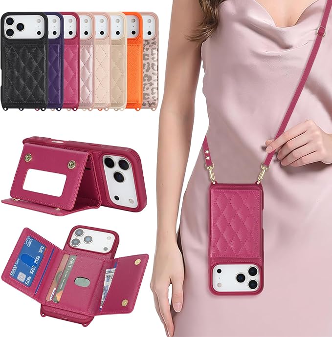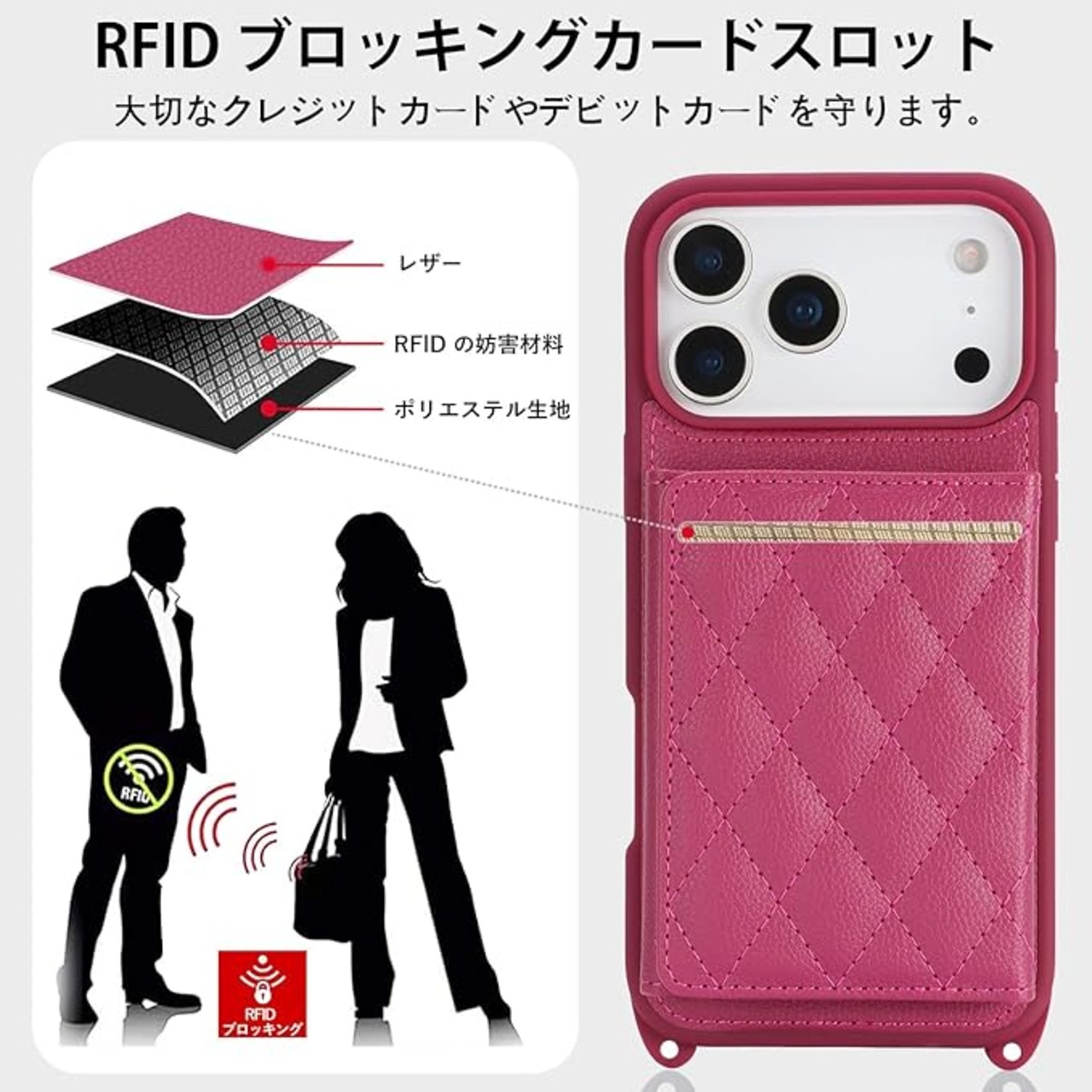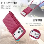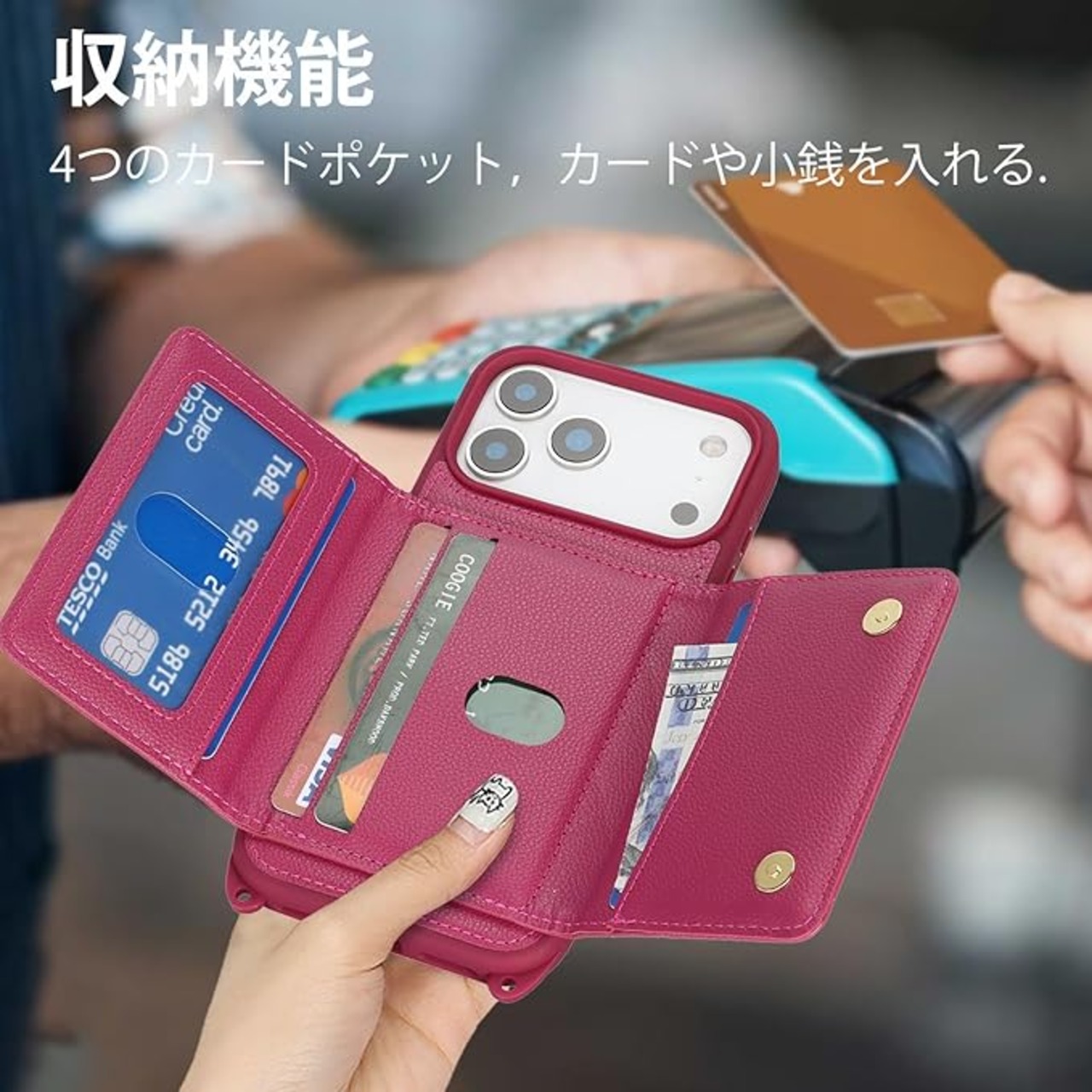 対応 iPhone 17 Pro Max ケース ショルダー いphone17 Pro Max ケース カード収納 鏡 肩掛け 斜めかけ スマホショルダー アイフォン17 Pro Max ストラップ付き 耐衝撃 調節可能な 携帯ケース - ローズレッド