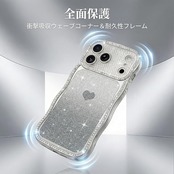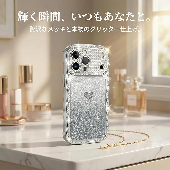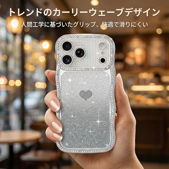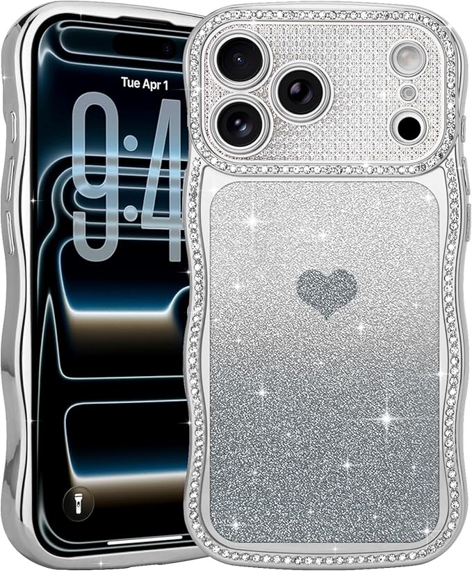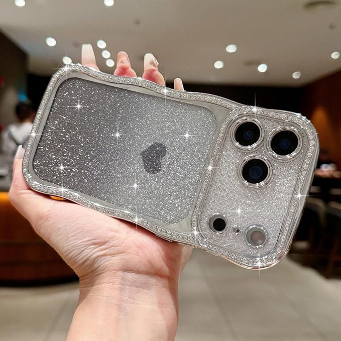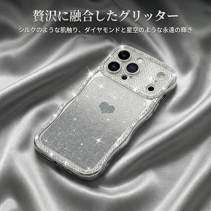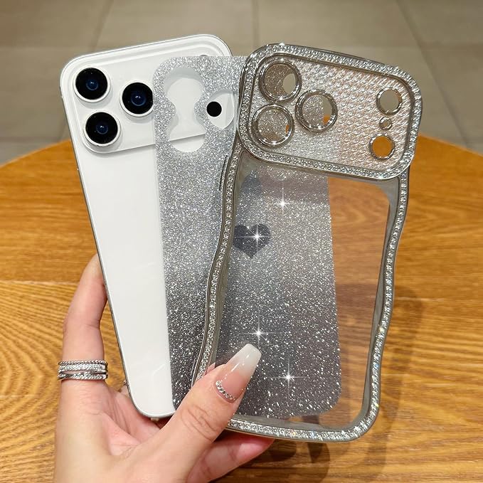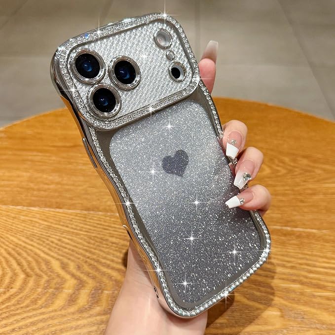 Teageo 用の iPhone 17 Pro Max ケース キラキラ 透明 ウェーブ スマホケース 女性 可愛い グラデーション グリッターカード ダイヤモンド TPU 薄型 軽量 耐衝撃 波型 滑り止め 用の アイフォン 17 Pro Max カバー (シルバー)