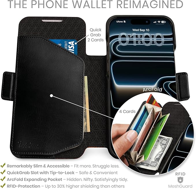 RFIDパイオニア – MagSafe対応-RFIDウォレットを発明したわけではありませんが、RFID保護機能付きウォレット型スマホケースを最初に開発しました。ArcFoldスロットはチップアンテナを100%保護し、一般的な他社製スロット(約80%)を上回る遮断性能を実現。薄型ケースながら、MagSafeワイヤレス充電・マウント・MagSafeウォレットにも直接対応しています。
