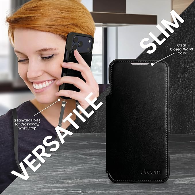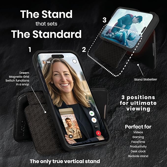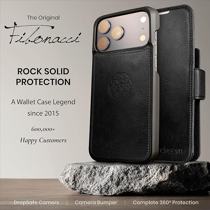 Dreem iphone 17 pro max ケースウォレット、画期的なスマートフォンスタンド、ヴィーガンレザー、MagSafeフィット対応、マグネット着脱式フリップカバー、RFID保護カードホルダー、ギフトボックス入り、 [Fibonacci:Black]