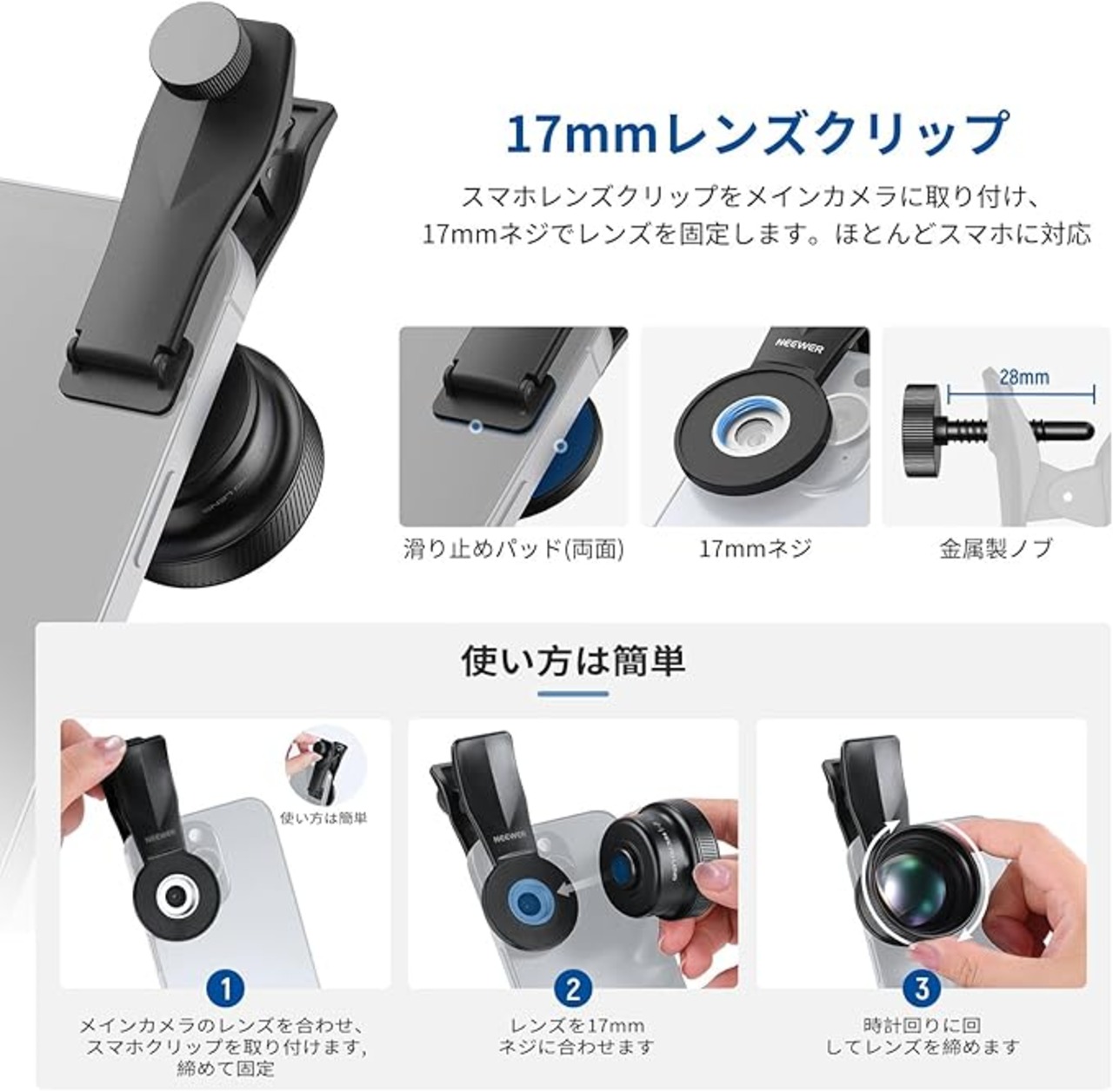 【17mmネジ付きレンズクリップ】 スマホレンズクリップをメインカメラに取り付けられ、17mmネジでレンズを固定します。 28mm調整可能な開口部を備、iPhone 17シリーズ、16 Pro Max、15、14、13 Pro Max、Android、Galaxy S25 Ultraに対応し、NEEWER 17mmネジ付きスマホケージ、スマホケース、バックプレートにも適合します。