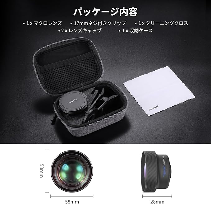 【パッケージ内容】1x マクロレンズ、1x 17mmネジ付きクリップ、1x クリーニングクロス、2xレンズキャップ、1x 収納ケース