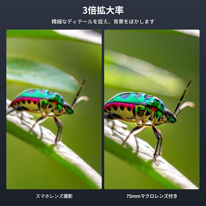 【75mmマクロクローズアップレンズ】75mmマクロレンズは、4-8.5cm最小焦点距離で3倍倍率を提供し、昆虫、宝石、コイン、植物など、クローズアップ被写体の複雑なディテールを自然なぼかしの背景で撮影します。