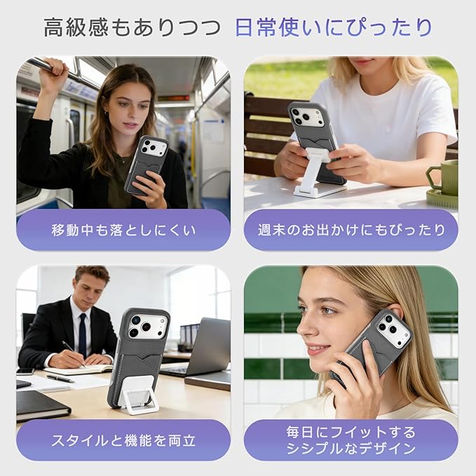 【収納機能・簡単設計】収納機能は背面に実用性のあるカード入れポケットを2つ設けておりカード類、ポイントカードなどを収納でき、通勤も通学にも便利です。シンプルなデザインで、ビジネスからプライベートまで様々なスタイルにも適用、多様な場面で活用できる高級感が溢れスマホケースです。フォーマルな場所でもカジュアルな場所でも違和感なく溶け込むデザインであり、様々喜びを長く感じさせてくれます。