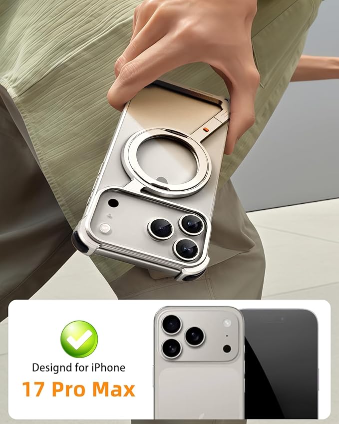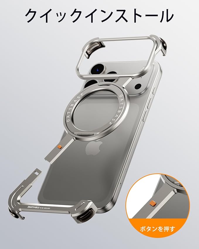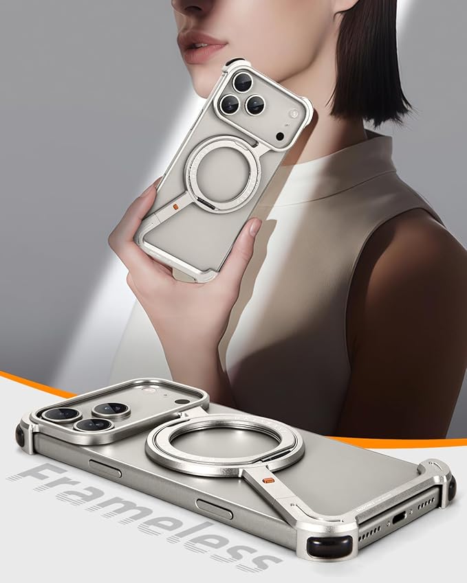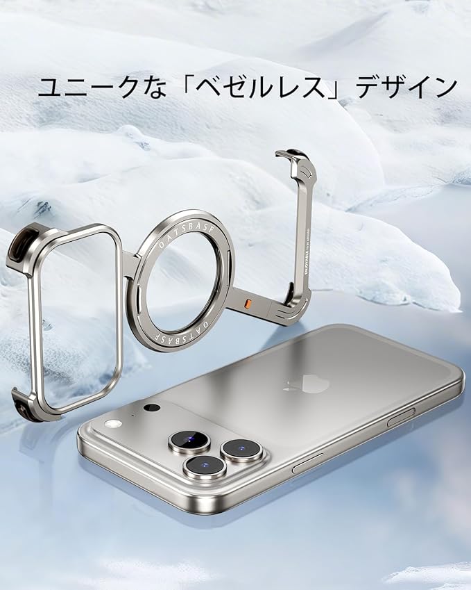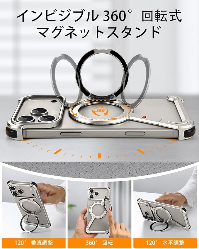 OATSBASF iPhone 17 Pro Max 用 ケース と互換性のあるミニマリスト スマホケース 360 回転キックスタンドアルミ金属フレームレスデザインバンパーケース 耐衝撃 横縦両立 MagSafe対応 ワイヤレス充電対応 保護ショックグレードシェル 天然チタン