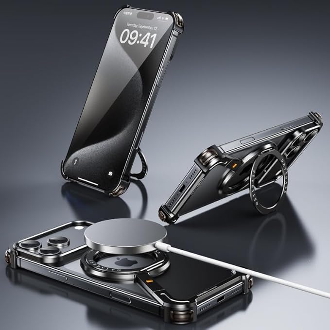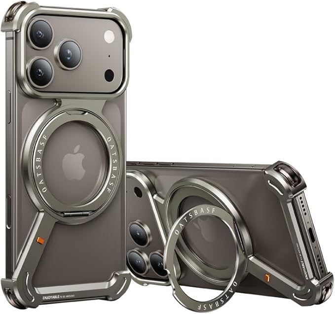 iPhone 17 Pro Max 用バンパーケース 360 回転リング magsafe対応 縦置き 横置き スタンド iPhone 17 Promax 用ケース メタルフレーム アルミバンパー かっこいい 四隅エアバッグ, 原色チタン