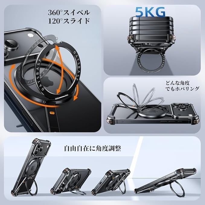 360 回転リングスタンド:ケース背面には、マグネット搭載・360 回転するリングがビルトインされています。スタンド機能が付いて、縦置き・横置き、どんな角度にもできます。
