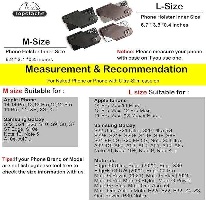 ➤2つのサイズ展開:このケースはほぼすべてのサイズのスマートフォンに合うように、2つのサイズオプションがあります。 Lサイズの電話ベルトホルスターの内部寸法は、6.75インチ x 3.3インチ x 0.3インチです。 iPhone 13 Pro max、Samsung Galaxy S22 Ultraなどにフィットします。Mサイズの電話ベルトホルスターの内部寸法は6.25インチ x 3.1インチ x 0.4インチです。iPhone 13 Pro、13、Samsung Galaxy S22などにフィットします。裸の携帯電話(ケースなし)でこのホルスターで最高の体験ができます。