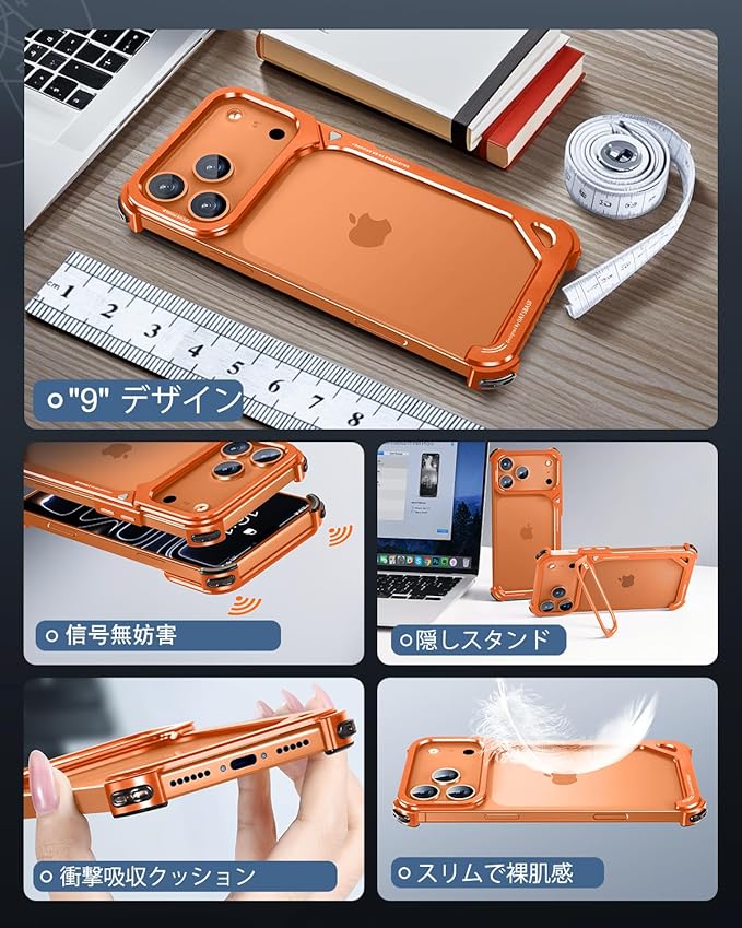 OATSBASF 9 ケース for iPhone 17 Pro Max バンパーケースメタル・アルミニウムフレーム、スリムフィット、ノーバックデザインMagSafe 対応、耐衝撃保護、ミニマルデザイン フレームレスフォンケース オレンジ