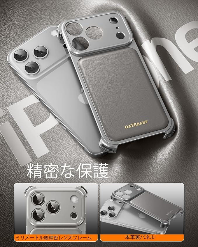 OATSBASF for iPhone 17 Pro Max ケースフルカメラ保護 MagSafe 充電器対応 メタルフレーム 本革製バックパネル