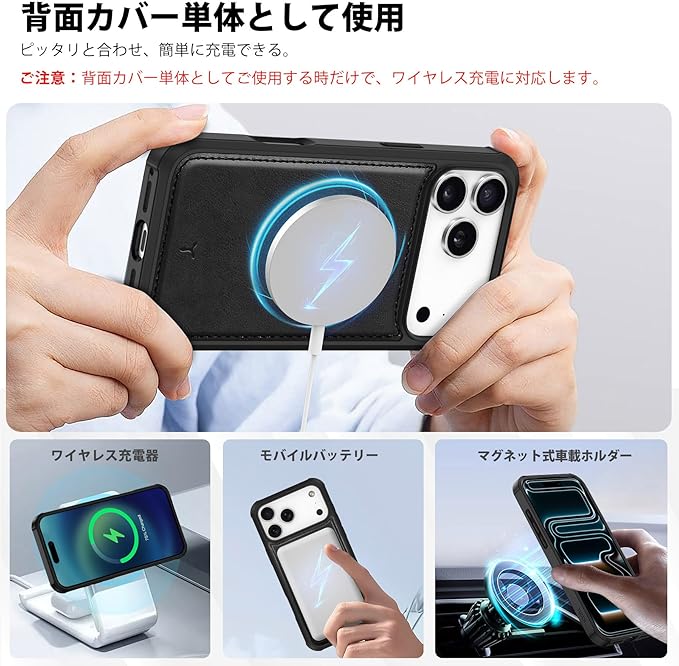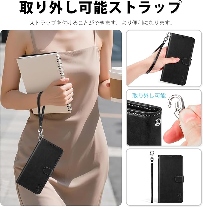 【2 in 1分離型&ストラップ付き】手帳型ケースとインナーケースは磁力で吸着され、用途に応じて簡単に取り外しが可能です。手帳型にも背面カバーにもなる便利な2in 1分離型ケースです。背面カバー単体として使用する際は、ワイヤレス充電に対応しています。手帳型ケースの上部にはストラップホールがあり、ストラップを手首に通せば、落下の心配もありません。背面カバーの下部にも縄用穴があり、お好きな縄を付けることができます。ご注意:付属のストラップは背面カバーの穴には使用できません。