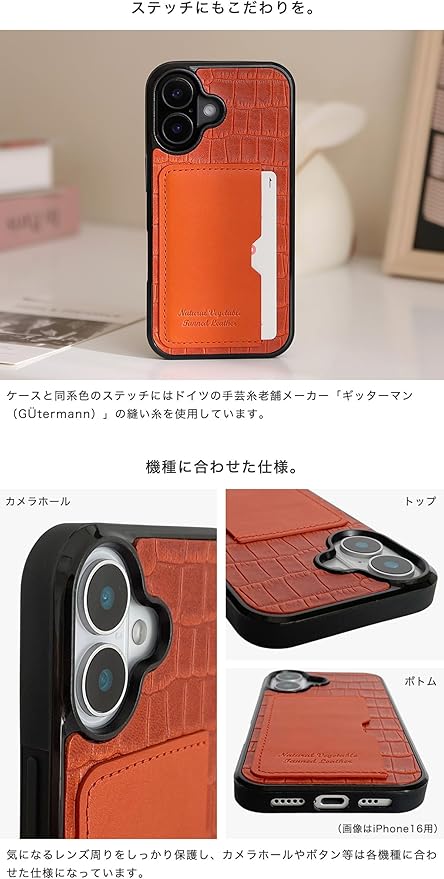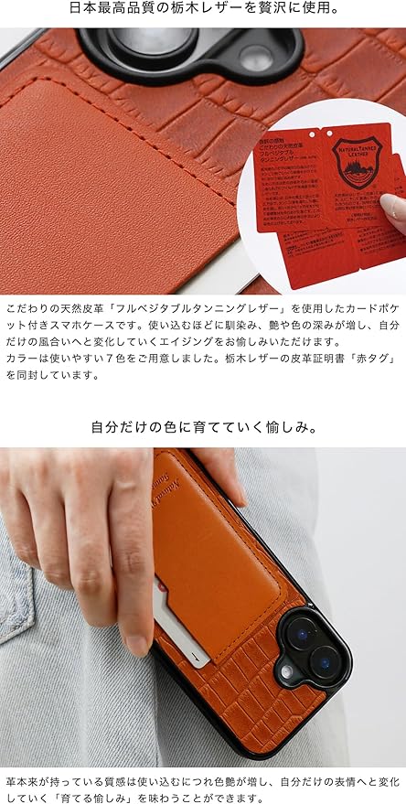 【素材】ケース背面 : 牛革 栃木レザー(牛皮を天然の植物由来のタンニンなめしを施した皮革)にクロコダイル模様をエンボス加工 カードポケット : 栃木レザー ※栃木レザーの皮革証明書「赤タグ」を同封しております。 ※仕入れる生産ロットや裁断箇所により、色合いや模様の出方が若干変わる場合がございます。「イメージと違う」など初期不良以外での返品・交換はご遠慮いただいております。予めご了承ください。 本体(内側) : PC(ポリカーボネート) 本体(側面) : TPU(熱可塑性ポリウレタン) ステッチにはドイツの手芸糸メーカー「ギッターマン(G termann)」の縫い糸を使用。