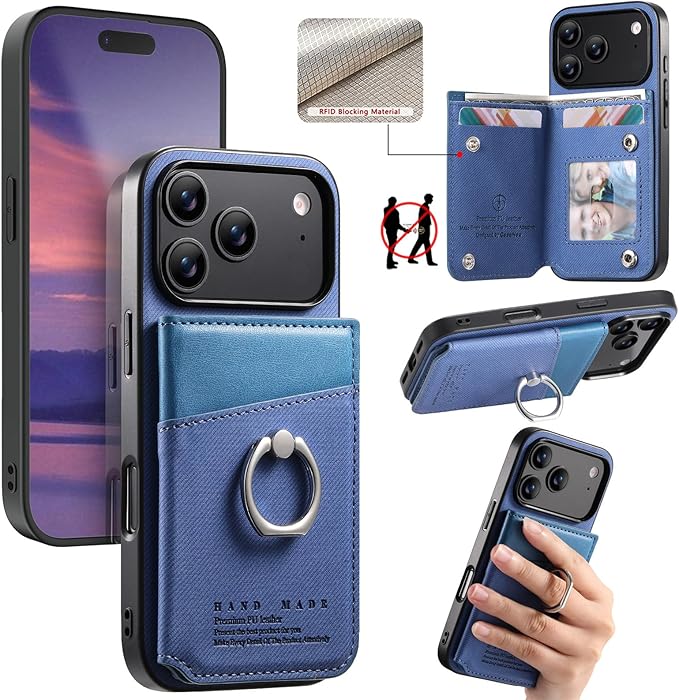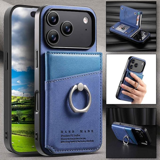 for iPhone 17 Pro Max ケース 手帳型 いphone17promax ケース カード収納 背面 iphone17プロマックス スマホケース 財布型 iPhone17ProMax カバー リング付き アイフォン17プロマックス カバー スタンド機能 RFIDブロッキング 耐摩擦 耐衝撃 シンプル リング おしゃれ - ブルー