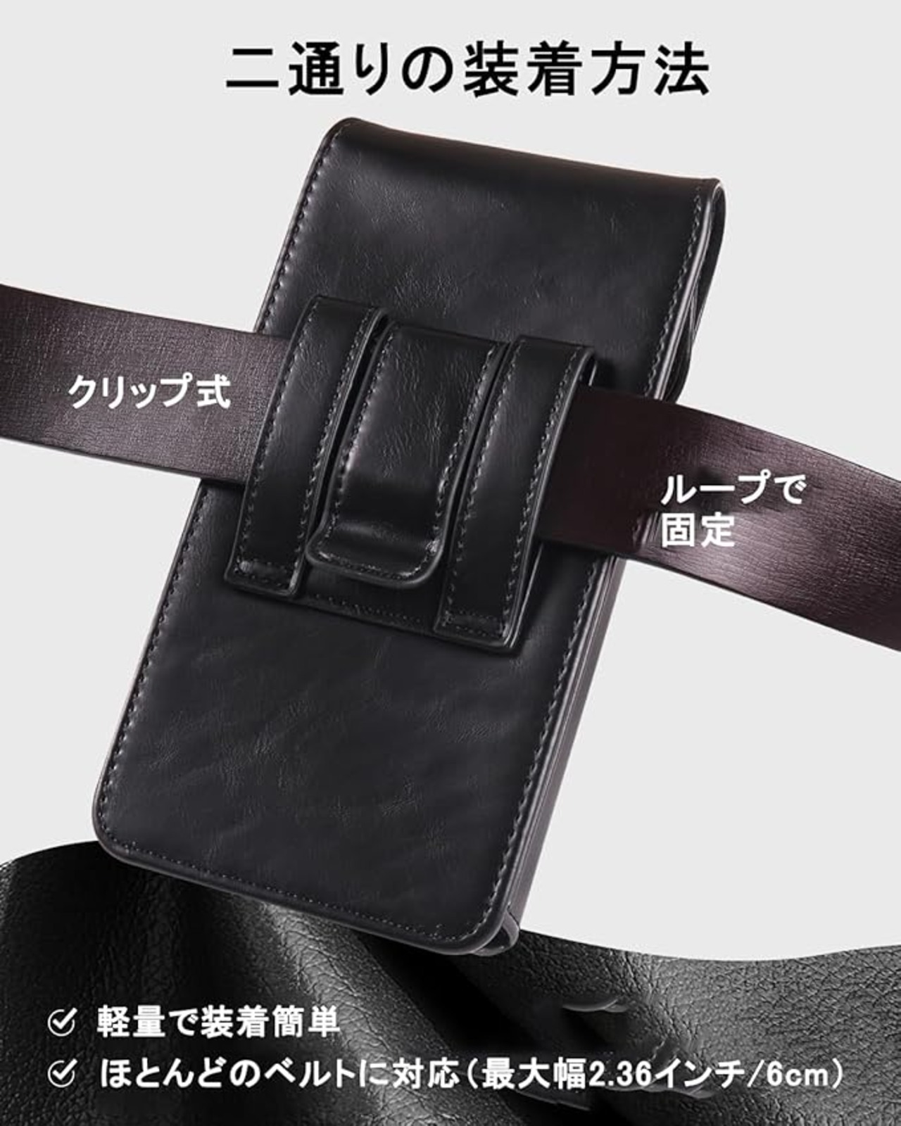 【装着簡単】このスマホベルトホルダーの装着はベルトクリップだけでも簡単にできます。2つのベルトループまで通せばより安定的に装着できます(ベルトの幅:60mmまで対応)。ベルトを直接通せばしっかりと固定できますし、ベルトの頻繁な着け外しがあるときは、クリップ状の金具で挟むだけの装着法を選べ、自由度は高いです。労働者には理想的な設計です。