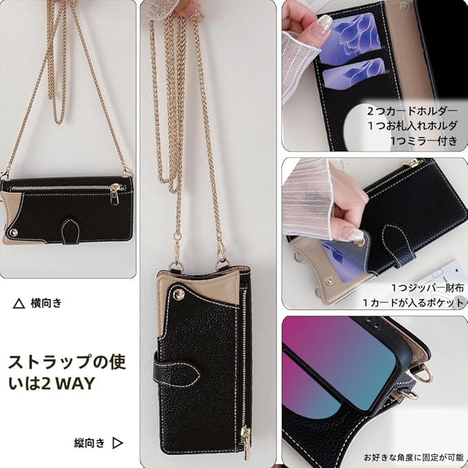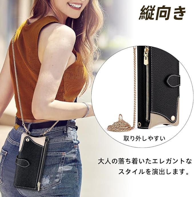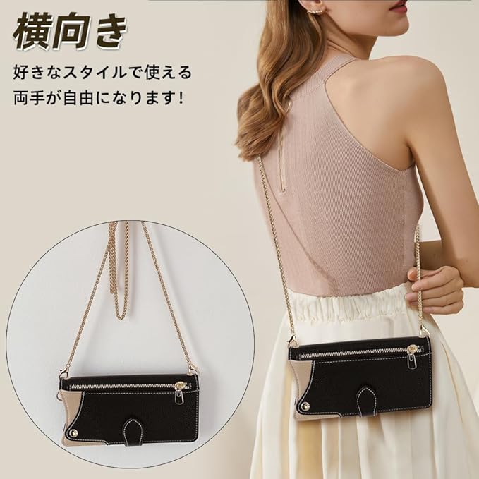 【3WAY多様な着用方法】付属の高級金属チェーン(全長1.2m)は褪色防止コーティングを施し。❶斜め掛け・ショルダー・ネックスタイルを自由にチェンジすれば、縦にも横にも掛けられ、自由に組み合わせられます、 両手がふさがる買い物中や観光時でもスマホを肌身離さず携帯可能。❷柔軟に分解でき、多用途で実用的。ショルダーストラップを外してオフィスではエレガントに使用し、着用後はアウトドアでエネルギッシュに使用できます。