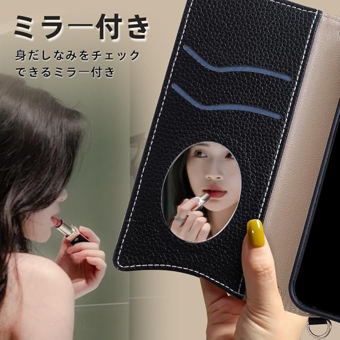 用の iPhone 17Pro Max ケース 手帳型 財布型カバー iPhone17プロマックス スマホケース マグネット留め 鏡付き 銭入れ あいふおん17ケースプロマックス マグネット式 化粧鏡 カード収納 斜めがけ ストラップ 首掛け PUレザー 肩掛け 横置きスタンド機能 携帯カバー 全面保護 ファッション 6.9インチ(ブラック)