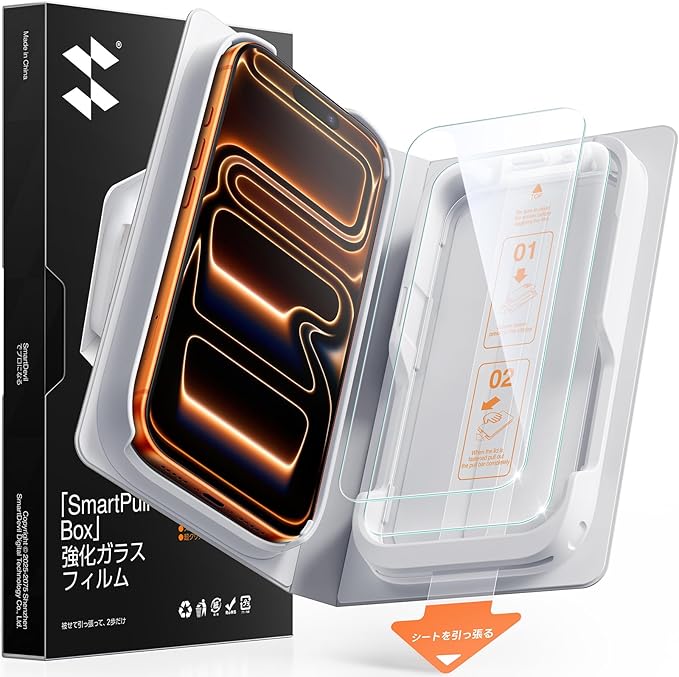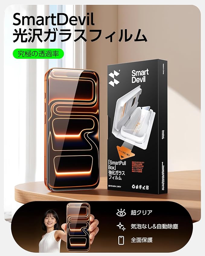 【20kg耐衝撃・秒貼革命】SmartDevil iPhone 17 Pro Max 用ガラスフィルム 2枚セット ガイドボックス付き 貼り付け超簡単 自動除塵 米軍MIL規格 黒縁なし 落下保護 滑らかな手触り 指紋防止「SmartPull Box」いPhone 17 Pro Max 対応 保護フィルム