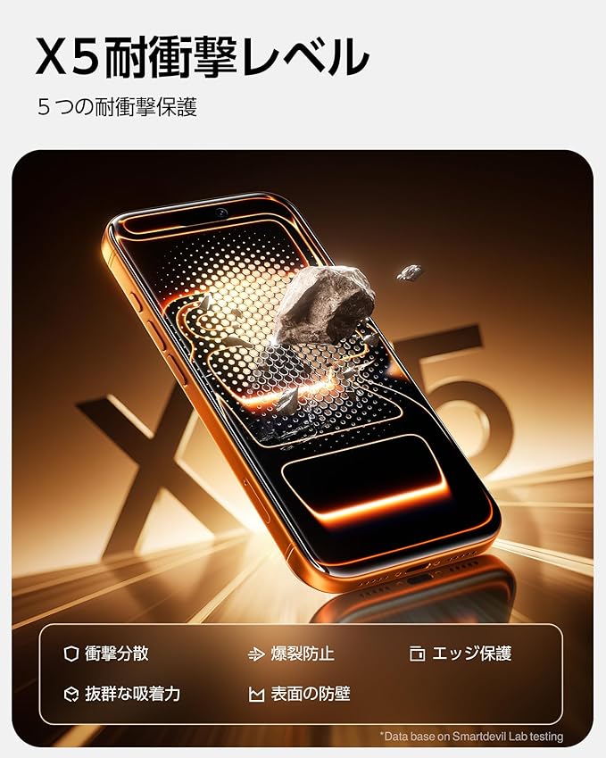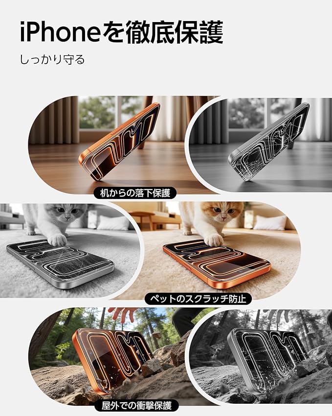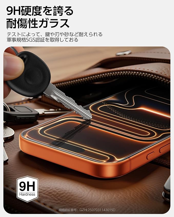 【20KG耐衝撃・飛散防止】SGS米軍落下保護規格の認証を取得しました!二次強化硬度と7層の複合構造で、超高温Na+/k+イオン交換技術など、多くの画期的な加工技術を採用し、20KG耐衝撃性を実現します。10000回の極限耐摩耗性テストで、小刀や鍵などの鋭利な物品でも擦り傷が付きません!