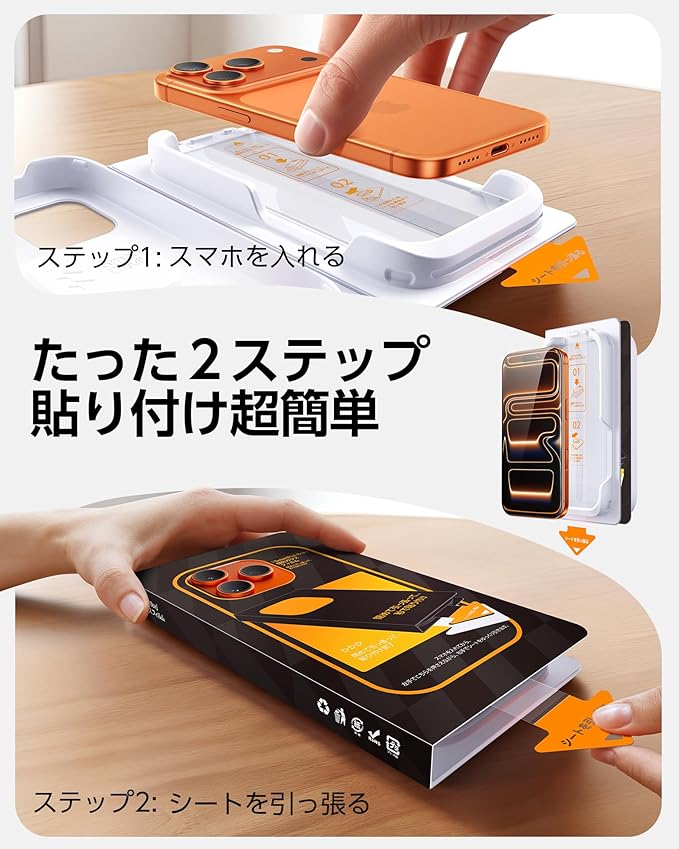 【秒貼革命・たった2ステップ】次世代なガイドボックスです!除塵シートを引くだけで、自動で埃が除去され、貼った後は気泡が残りにくいです。2ステップだけで初心者でも簡単に貼り付け!ガイドボックスにスマホを入れ、蓋を閉めて、除塵シートを引っ張ると貼り付け完了です!