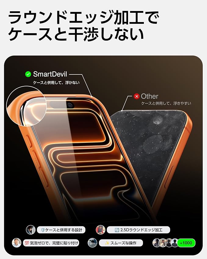 【ケースと併用】本体の縁まで適度なスペースを残しており、装着後もスマホのデザインを損なわず、ケースとの相性も抜群です。2.5Dラウンドエッジ加工で、シルクのような滑らかさを実現しています。