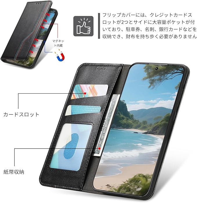 【優れた収納機能】このiphone17プロマックスケース 用フリップカバーには、クレジットカードスロットが2つとサイドに大容量ポケットが付いており、駐車券、名刺、銀行カードなどを収納でき、財布を持ち歩く必要がありません。ショッピング、旅行、仕事など、様々なシーンに完璧に適応します。