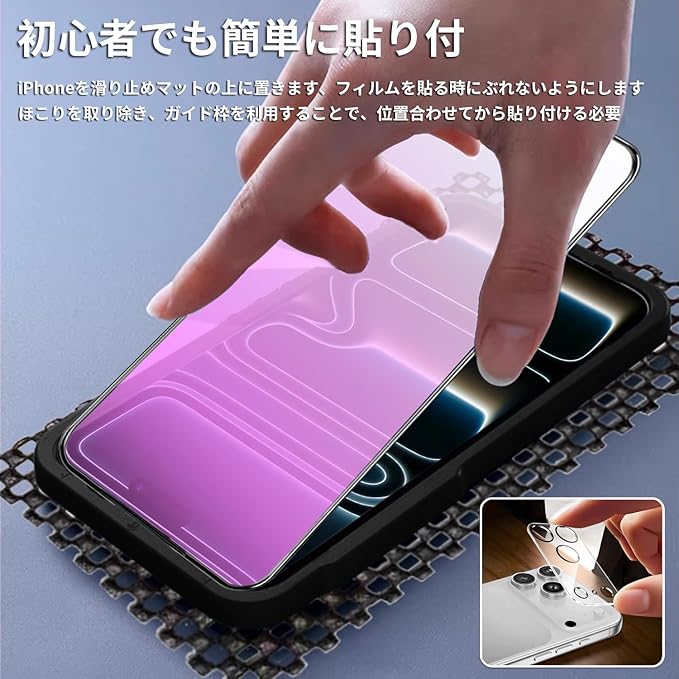 ★【対応機種】iPhone 17 Promax(アイフォン 17 プロマックス)用。同梱物:ブルーライトカット強化ガラスフィルム2枚、レンズ保護フィルム 2枚 、ガイド枠1個 、滑り止めマット*1、取扱説明書。【品質保証】何か質問がある場合は、弊社に連絡してください。万一、ガラスフィルム 発送中に故障や不良を発生した場合、ご遠慮なく、「アカウントサービス」>「注文履歴」>「販売:DZHFU」>「質問する」弊社と連絡してください」。私たちはお早めに対応いたします。お客様が満足できるまでアフターサービスを提供します。