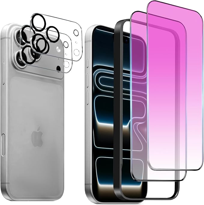 【4枚入り】iPhone 17 Pro max 用 ガラスフィルム 6.9インチ ブルーライトカット 全面保護フィルム 目の疲れを軽減 硬度10H 滑らかなタッチ操作 指紋付着防止 気泡防止 ガイド枠付き 貼り付けは簡単 【アイフォン17 プロマックス 強化ガラスフィルム(2枚入り)+レンズ保護フィルム (2枚入り)】