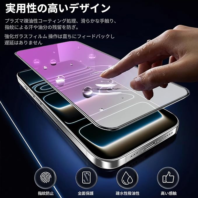 特徴 硬度10H/ブルーライトカット機能・目の疲れを軽減/ラウンドエッジ加工/高感度タッチ/指紋・汚れ防止/飛散防止/貼り付け簡単